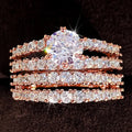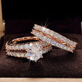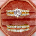 This bridal ring set features sparkling cubic zirconia stones in a refined geometric design, created to symbolize love, balance, and modern elegance.